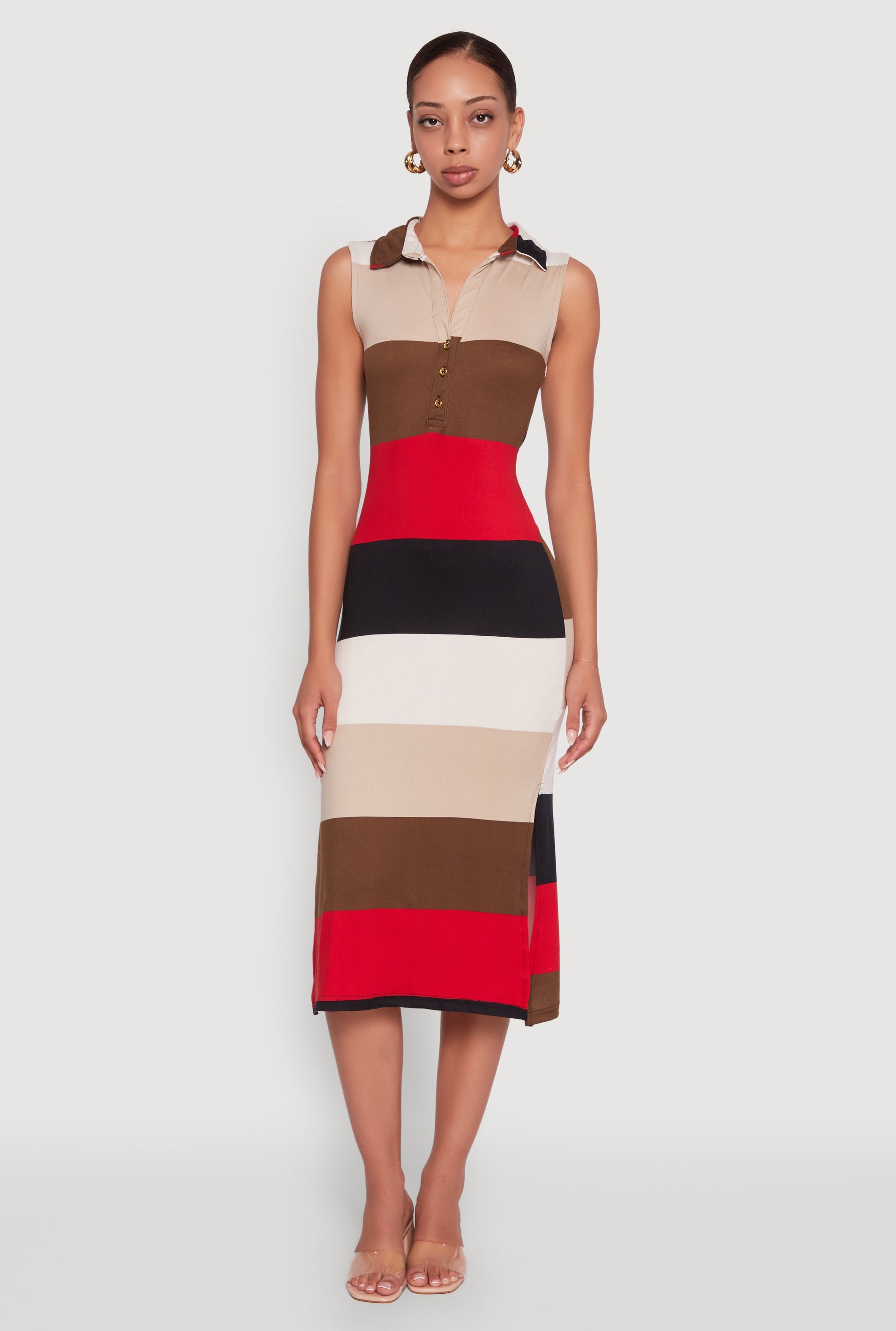Color Blocked Striped Polo Collar Sleeveless Midi Dress